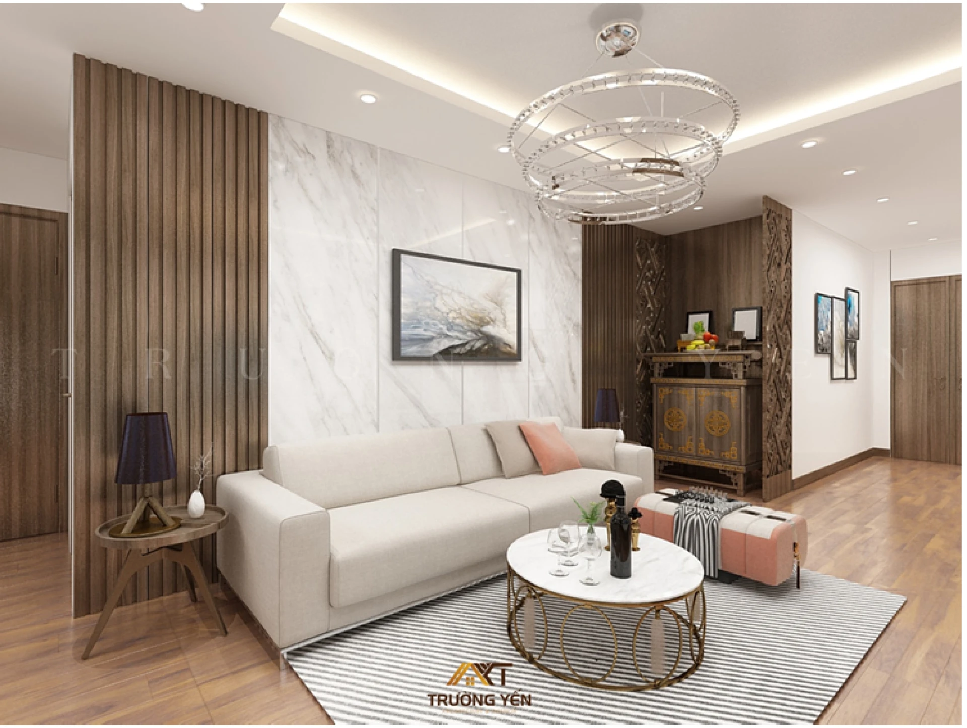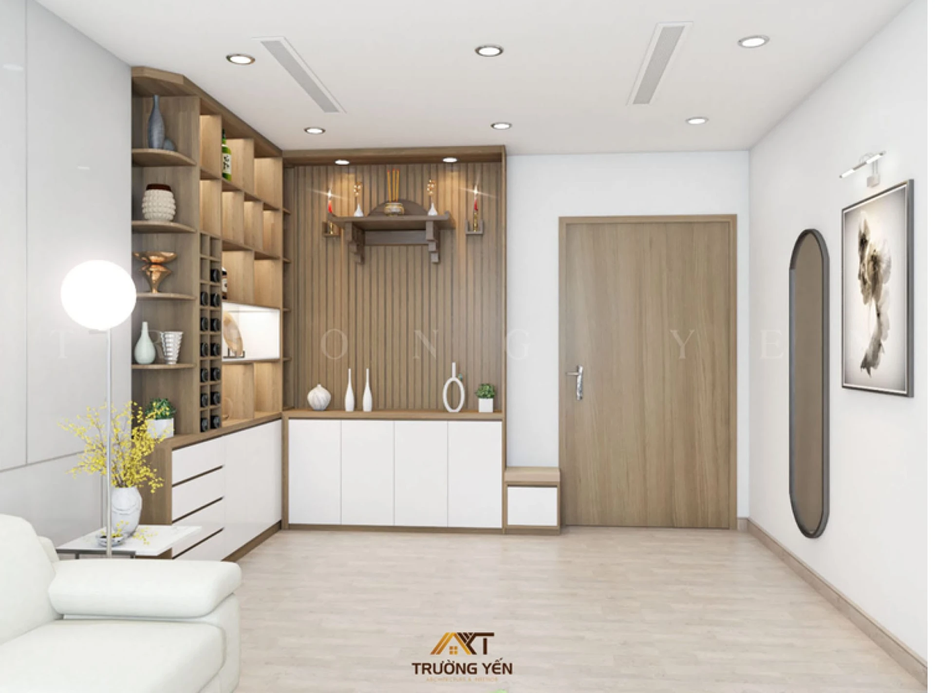 Một hệ thống tủ thờ có kích thước phù hợp và kiểu dáng thanh lịch góp phần tạo nên sự trang trọng cho không gian vô cùng đặc biệt này.